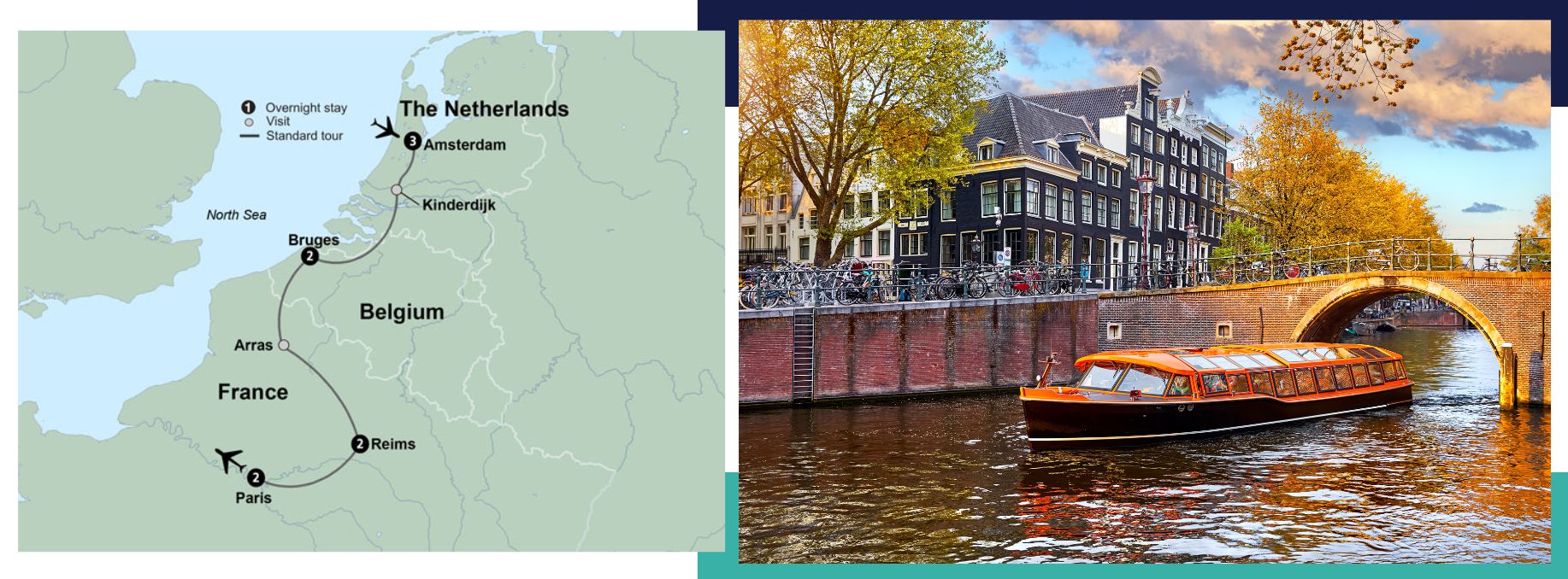 From iconic Dutch windmills and cozy Belgian streets to the world-renowned Champagne region and the “City of Light,” experience the essence of three European countries. Connect with deeply rooted cultures as you make your way through the Netherlands, Belgium, and France.