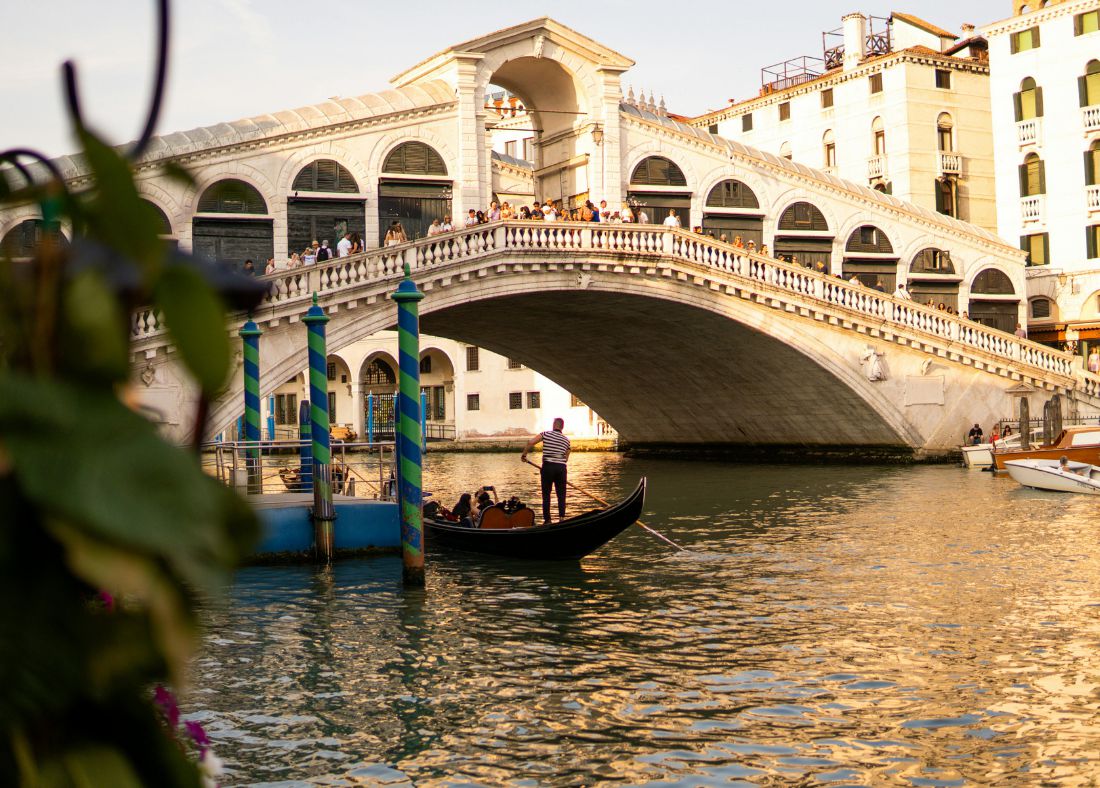 As your water taxi glides past narrow side canals and the Canal Grande, you’ll arrive in style at the Rialto Bridge. The iconic stone arch bridge sits at the narrowest point of the Canal Grande and holds numerous shops and restaurants.