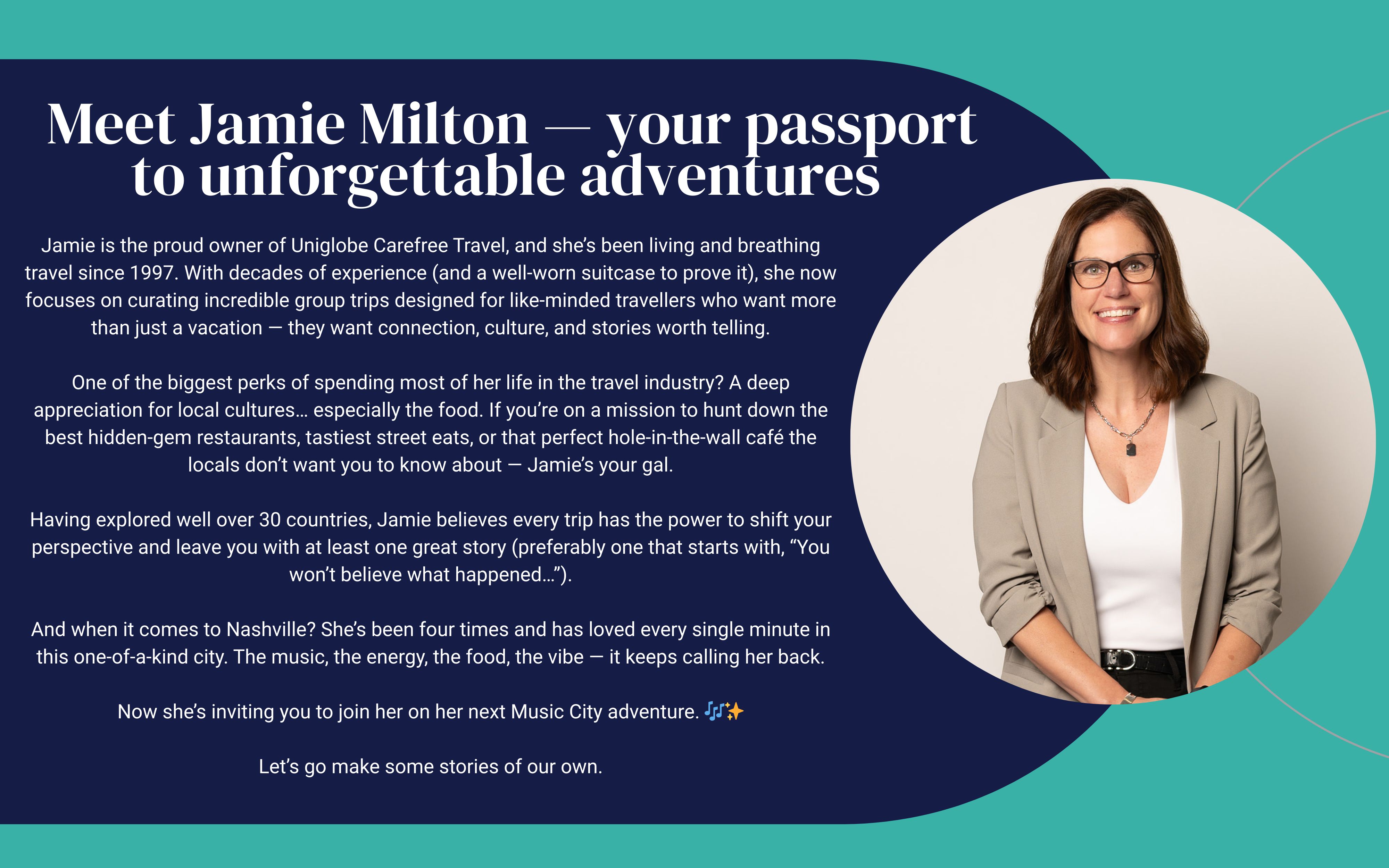 Pack your bags for a 4-night escape to Nashville hosted by Jamie Milton — where live music, Southern charm, and unforgettable experiences are waiting for you.