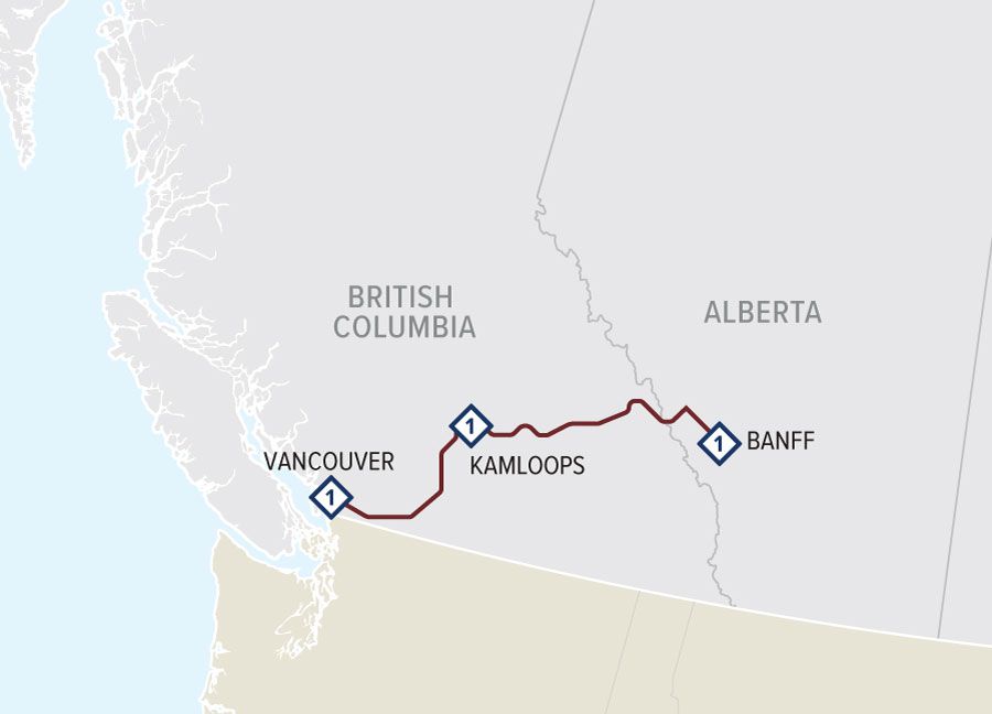 Departing early in the morning, travel onboard Rocky Mountaineer from the coastal city of Vancouver to Kamloops, located in the heart of British Columbia's interior. On today's journey, you will see dramatic changes in scenery, from the lush green fields of the Fraser Valley, through forests and winding river canyons surrounded by the peaks of the Coast and Cascade Mountains, to the desert-like landscapes of the BC interior. Highlights include the rushing waters of Hell's Gate in the Fraser Canyon and the steep slopes and rock sheds along the Thompson River. Your day ends in the evening as the train travels along the shores of Kamloops Lake into the town of Kamloops.