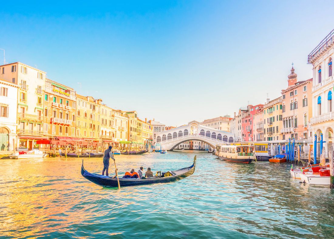 As your water taxi glides past narrow side canals and the Canal Grande, you’ll arrive in style at the Rialto Bridge. The iconic stone arch bridge sits at the narrowest point of the Canal Grande and holds numerous shops and restaurants.